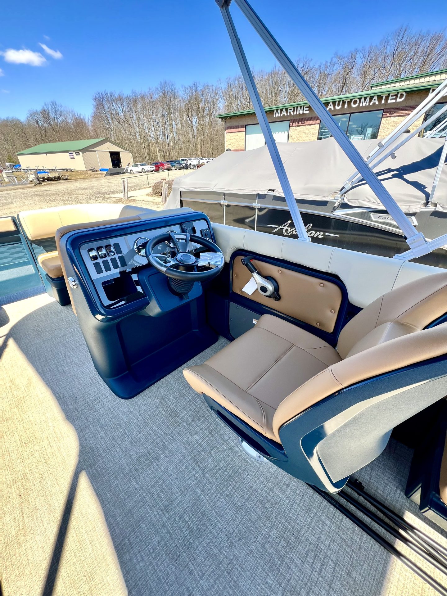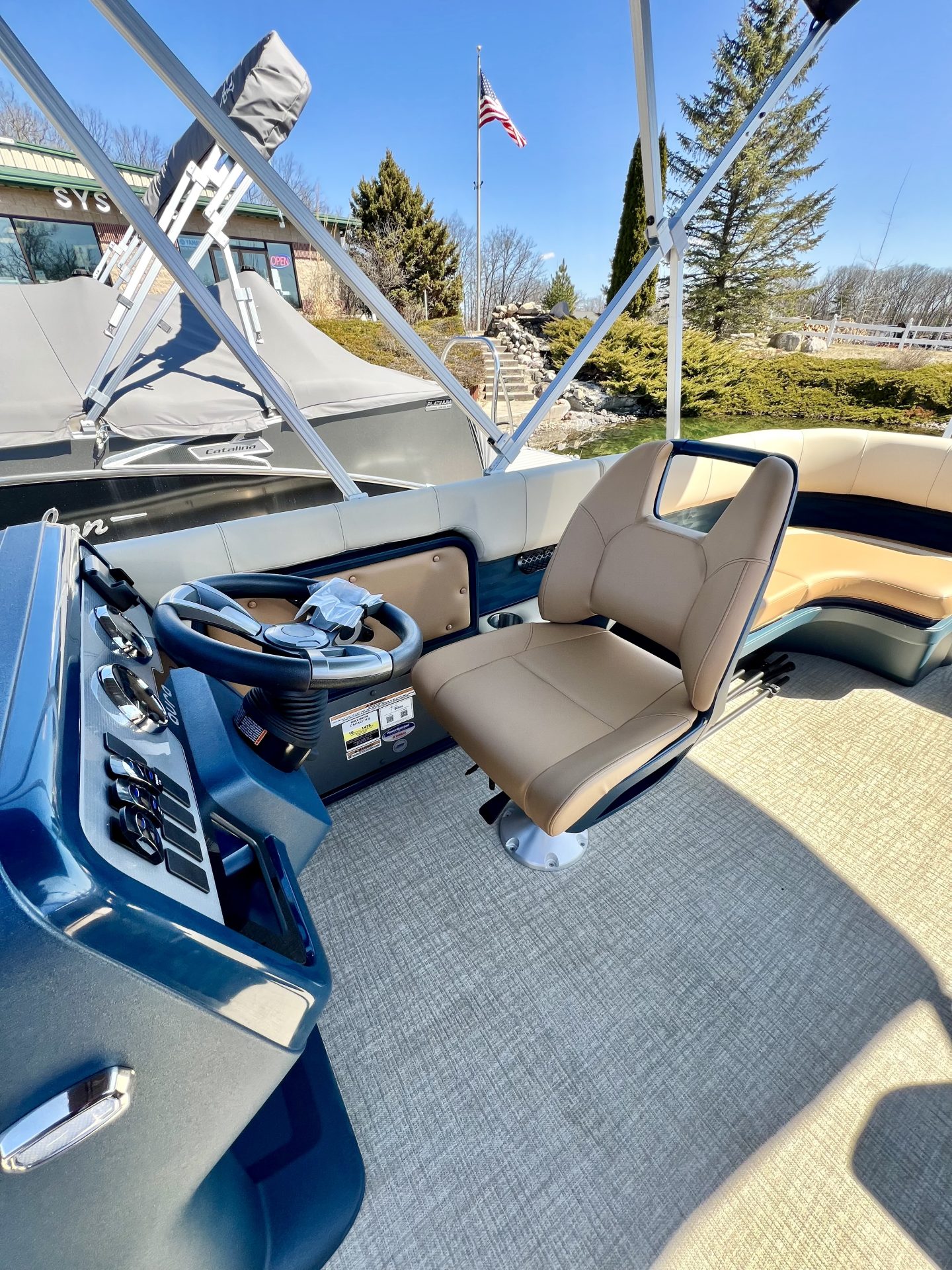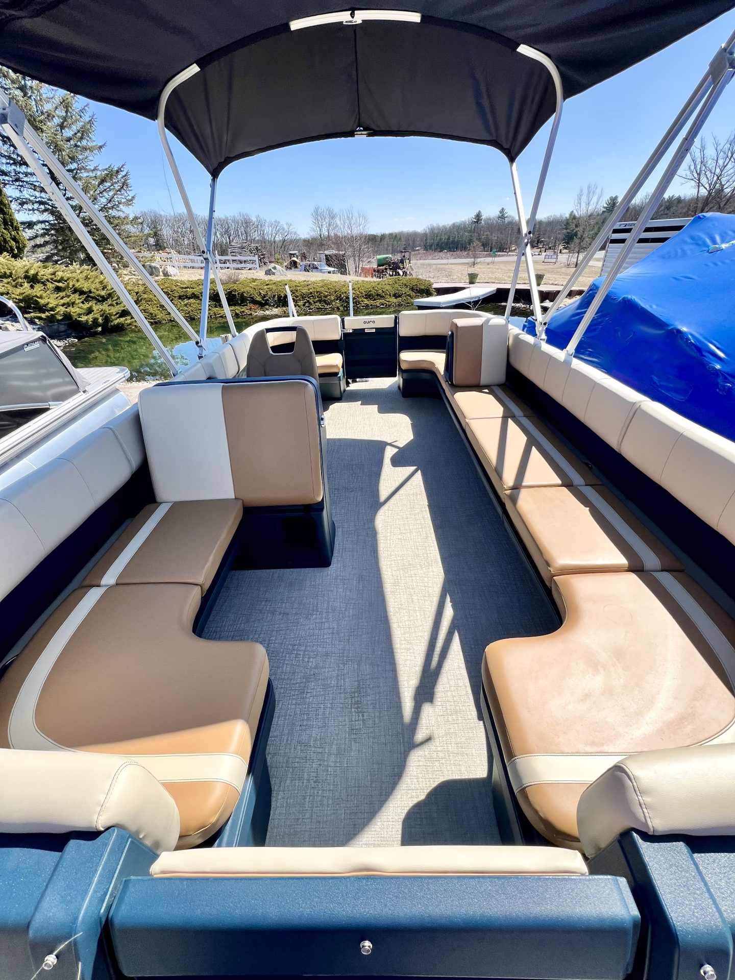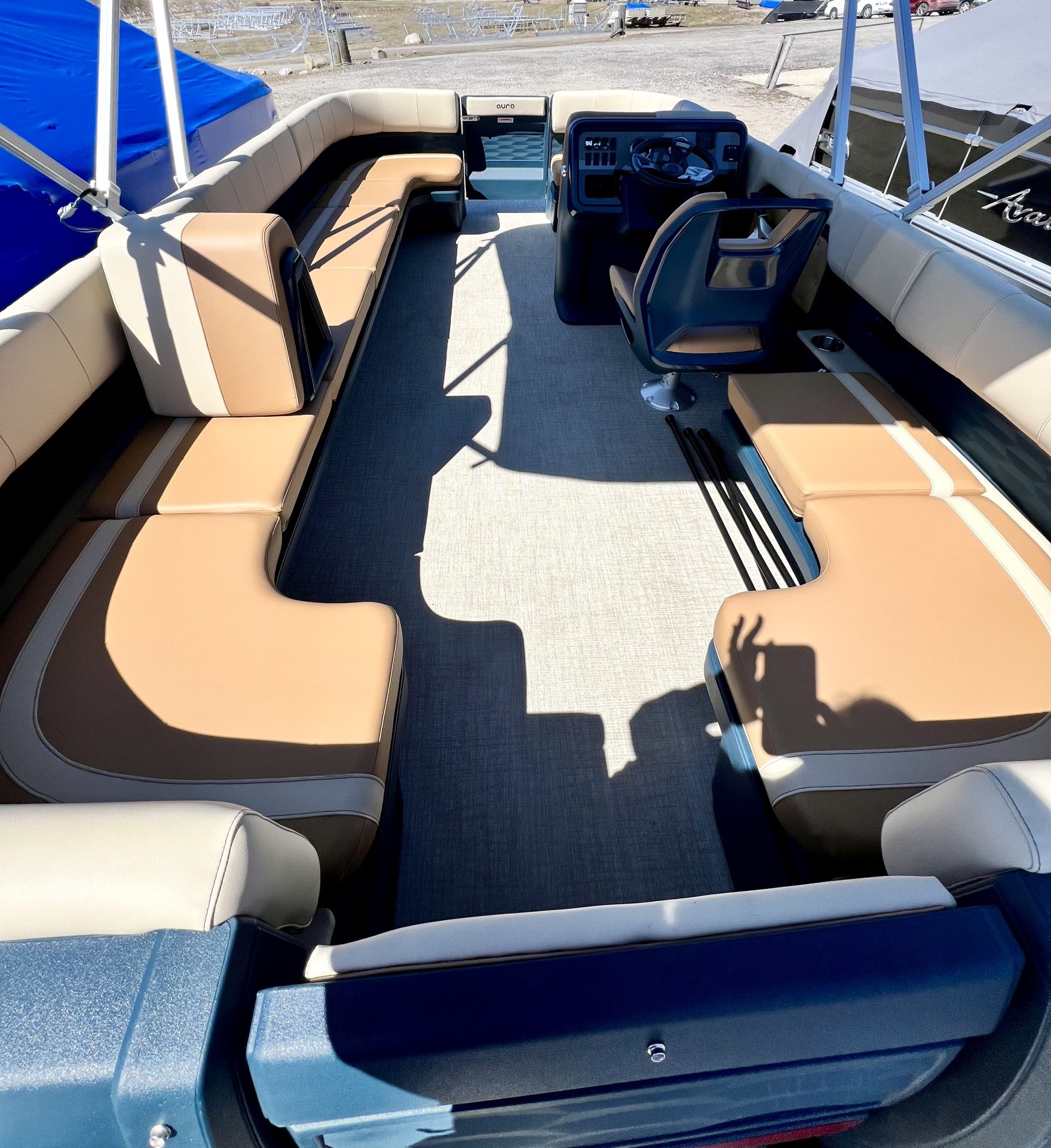 Adventure awaits beyond every horizon. With Aura, you’re equipped to explore the unknown, chase the sunset, and create memories that will last a lifetime. Aura Pontoons exclusive use of EF-Tech is a cutting edge innovation in wall, helm, and seat base construction. Our EF-Tech is a modernized evolution of rotocast, delivering enhanced durability and performance. This true technological advancement ensures that every Aura Pontoon is built to withstand the toughest conditions while maintaining exceptional comfort and style. Experience the future of boating with EF-Tech, where innovation meets tradition. This boat features the Heritage color, combining Blue sidewalls, Rich Leon Cognac seating, Riptide Dune flooring and Red accent stripe! Take your music with you while you play with 2 portable JBL Flip 6 speakers and a phone charger right in the helm! This Aura is rigged with a 70 hp Yamaha 4 Stroke MSRP $38,606.25, MADS Price $30,659.60! Stop in and see it today